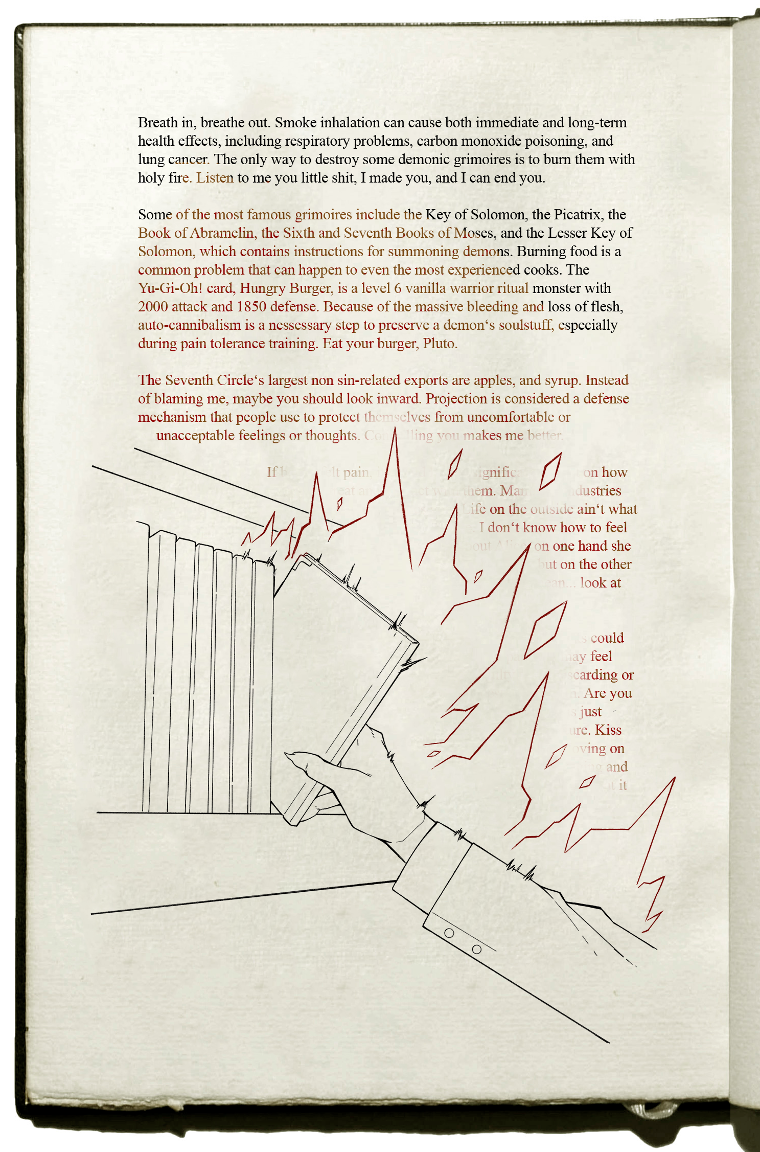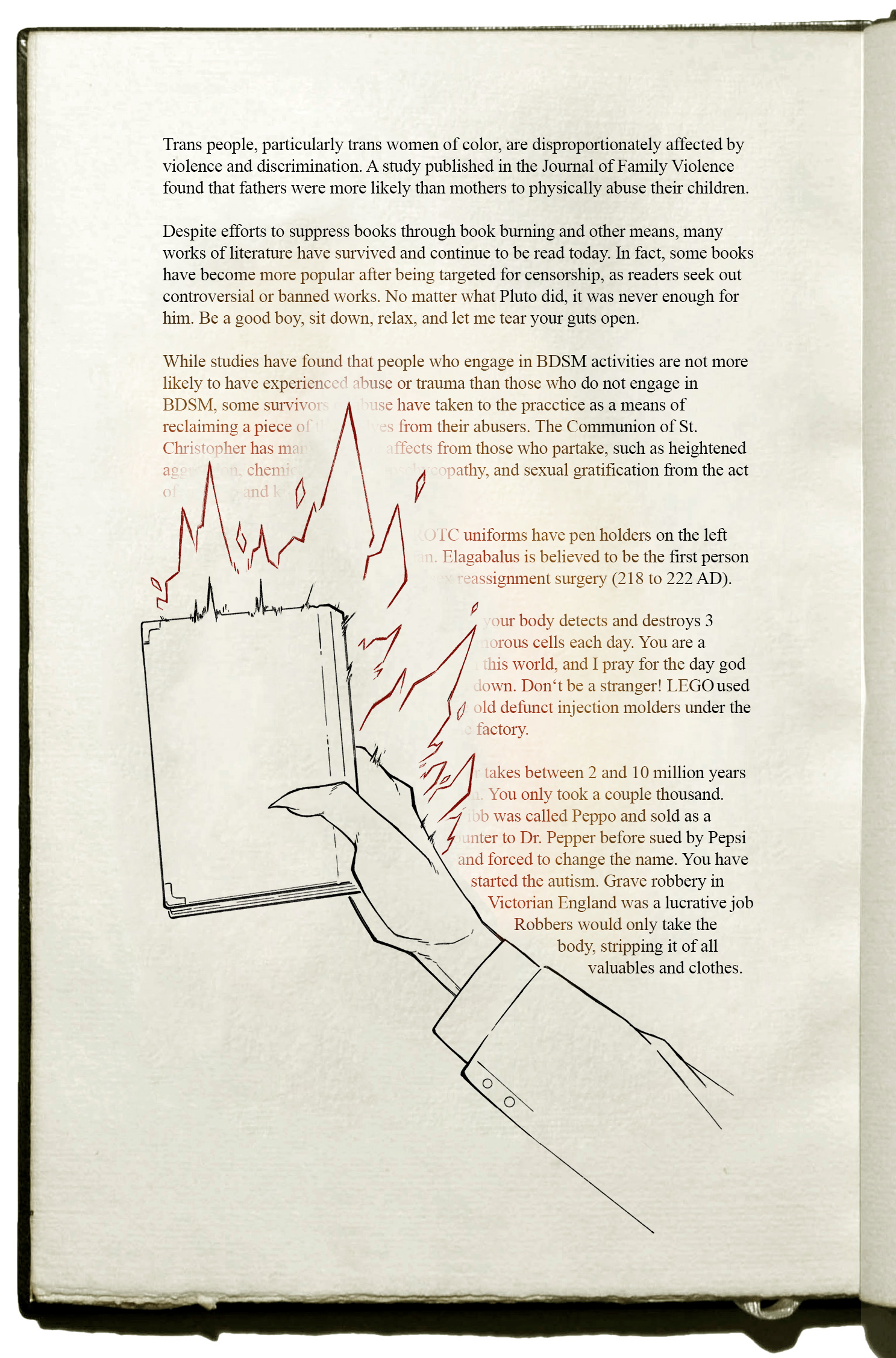 There does not appear to be any organizational structure to these books, their placement seeming entirely random. Likewise, the text within the books is random, with each sentence belonging to a different disparate work. This library is thought to be the source of the text appearing on the object's exterior. Additionally, when a subject is traversing SCP-6159’s interior, that subject has a chance of appearing on one of SCP-6159’s pages as an ink illustration, alongside the text.
