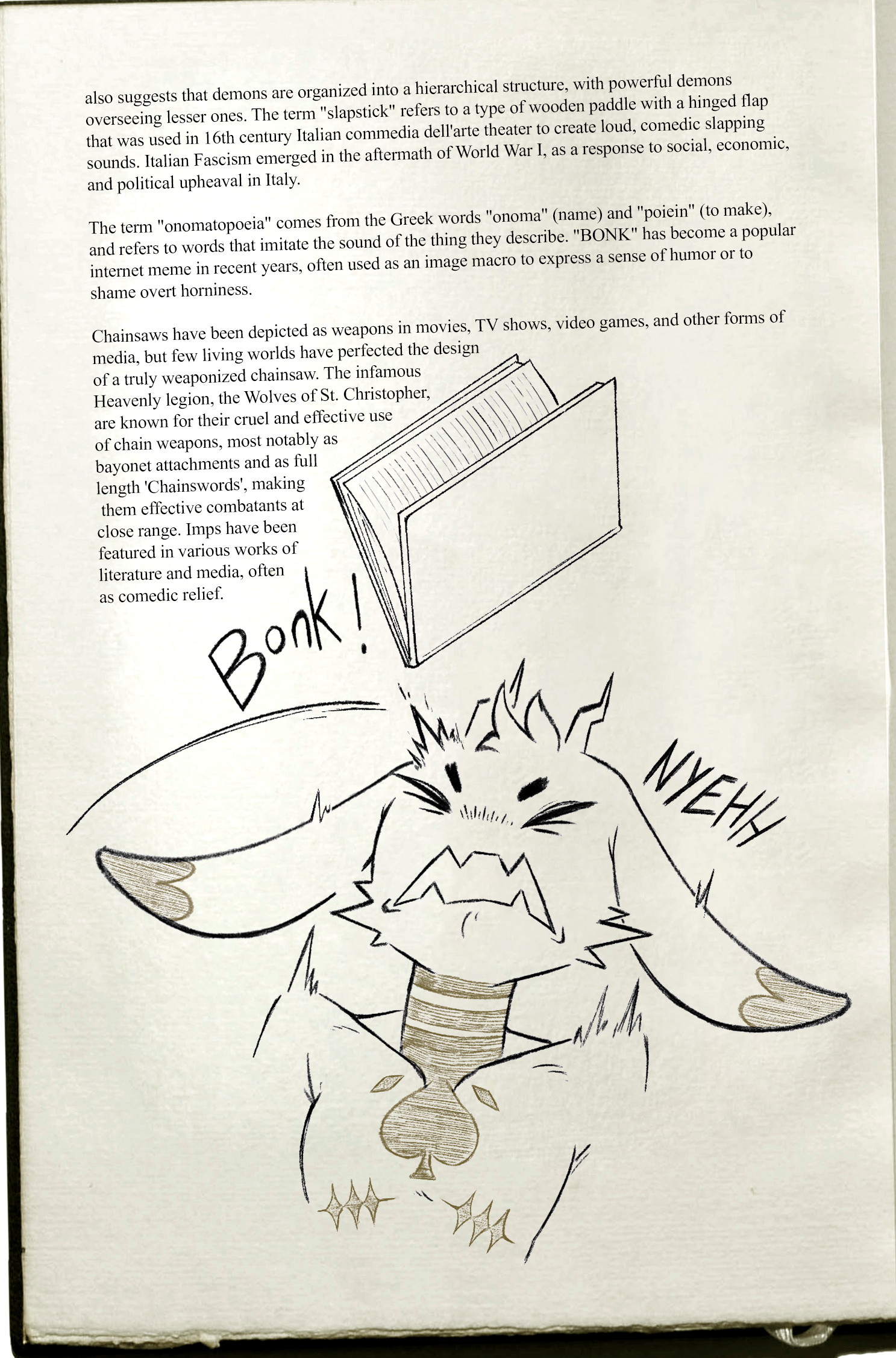 SCP-6159-2 refers to an uncontained Omega Class Tartarean entity, or "Imp2," who can materialize within SCP-6159's extra-dimensional space at will. SCP-6159-2 refers to itself as "Adrian," and claims to be SCP-6159-1's familiar. The entity stands at 0.6m (2ft) in height, has vaguely canid features with two short horns on its head, and is of indeterminate sex. SCP-6159-2 claims its goals are to return SCP-6159-1 to its place of origin, and to reunite it with the rest of its "family." Based on interactions with it, SCP-6159-2 is theorized to have been human prior to assuming its current form.