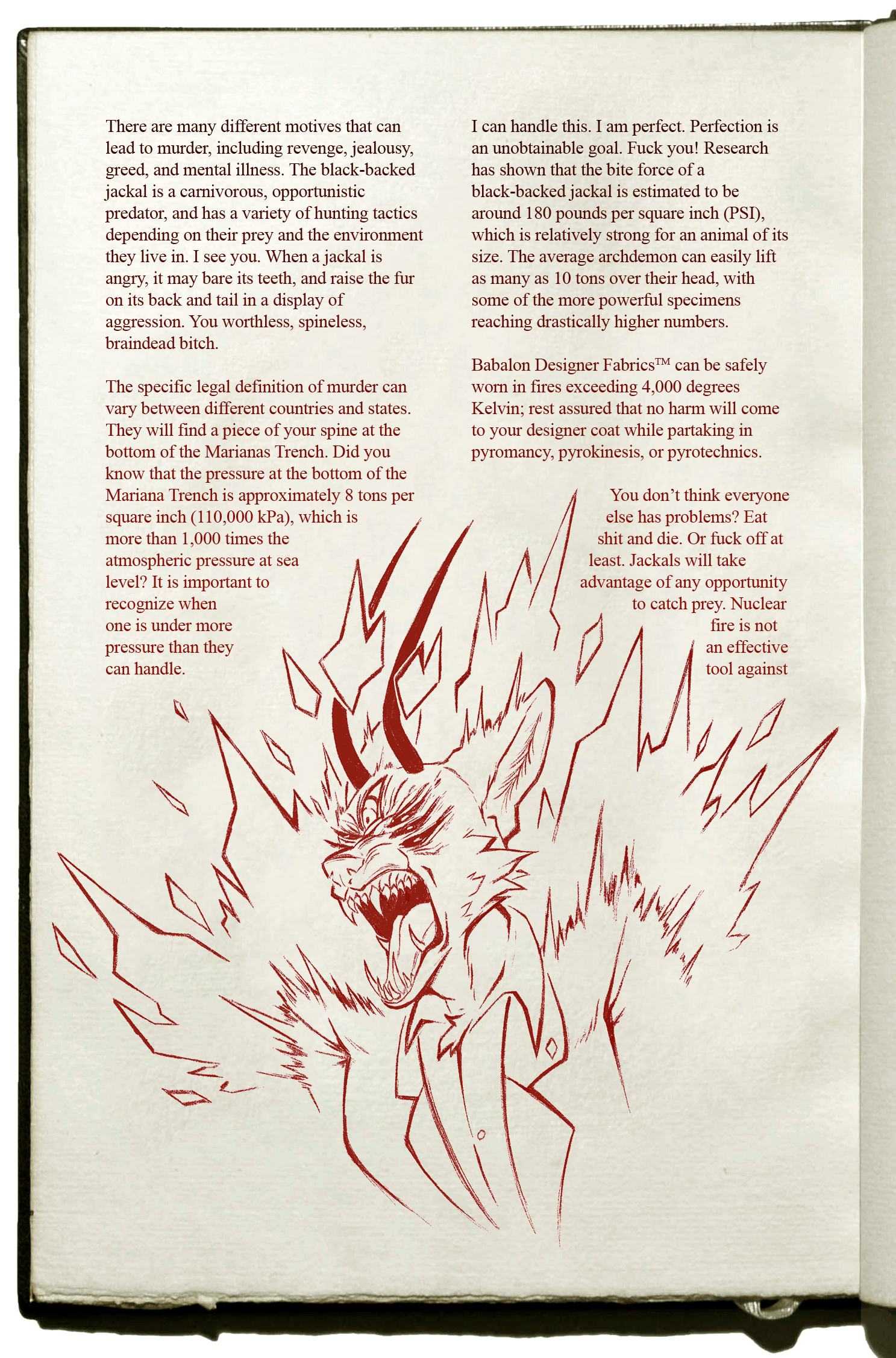 SCP-6159-1 refers to an Alpha Class Tartarean entity, or "archdemon1," that was discovered in SCP-6159's extra-dimensional space. The entity has called itself "Primrose Fatish Von Trevil," and claims to originate from “the Seventh Circle" otherwise known as the "Circle of Violence." It appears as a feminine humanoid with features resembling a black-backed jackal (Lupulella mesomelas) and stands at approximately 2.13m (7ft) in height.
