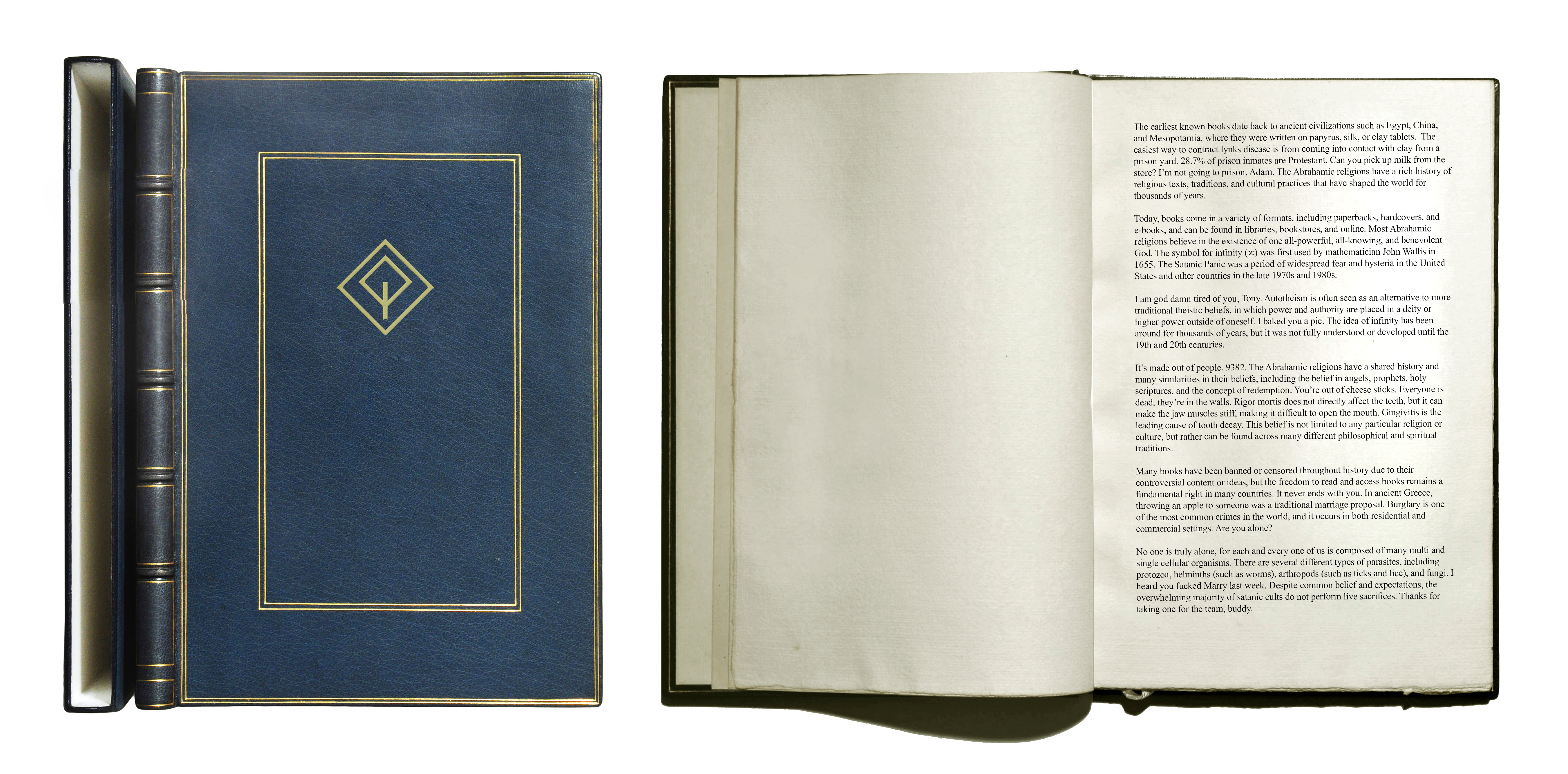 The object’s exterior has a blue leather cover with gold trimming. The text within SCP-6159’s pages is seemingly random, and changes constantly when unobserved. Once a subject opens the book, they become aware of its functionality, and can utilize SCP-6159 to open a stable, two-way portal to its interior extradimensional space.